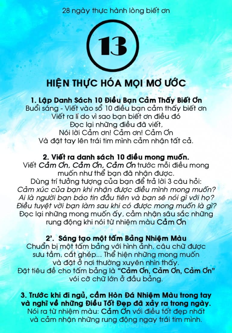 Bài tập 13 hôm nay rất đặc biệt và quan trọng, với tên gọi: Thực hiện hóa mọi mơ ước. Trong 12 Bài tập đầu tiên, chúng ta đã khởi lòng biết ơn cho những điều mình đã và đang có. Bắt đầu từ bài tập 13 đến bài tập 22, chúng ta sẽ học cách khởi lòng biết ơn cho những điều mình muốn có trong tương lai nha! Từ hôm nay, chúng ta bắt đầu dùng sức mạnh của luật hấp dẫn kết hợp với lòng biết ơn để có thể thu hút những điều tốt đẹp về với mình đây.