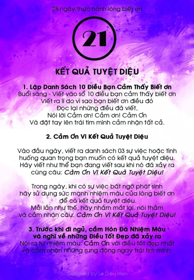 8. Cảm ơn bài tập Kết quả tuyệt diệu giúp mình biết tạo thói quen gửi lời chúc phúc, niềm tin và sự biết ơn cho kết quả tốt đẹp trước khi làm một việc gì đó, từ việc nhỏ nhặt đến việc quan trọng hơn. Điều đó đã giúp mình chuẩn bị tinh thần cao hơn trước khi bắt tay vào công việc đó, từ đó ảnh hưởng đến cách làm việc của mình và dễ thu hút những kết quả suôn sẻ hơn. Ngay cả khi kết quả không được như mong đợi cũng giúp mình bớt hoang mang, rối trí và ổn định tinh thần hơn so với trước đây rất nhiều, nhờ trạng thái đón nhận kết quả tốt đẹp, dù kết quả đó hiển lộ thực tế như thế nào. Cảm ơn, Cảm ơn, Cảm ơn.