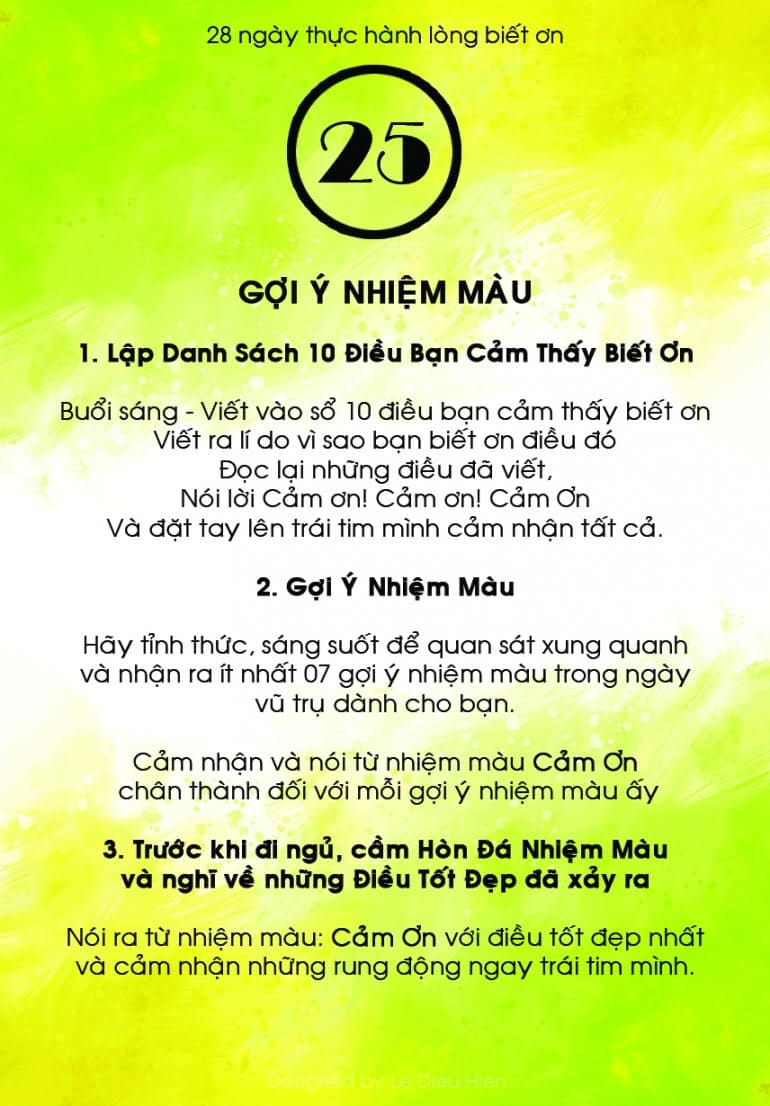 7. Tôi vô cùng hạnh phúc và biết ơn bài tập 25 đã giúp mình cảm thấy cuộc sống thật đáng yêu và hào hứng hơn với việc chú ý đến các tin tức, sự vật, con người… hiện diện xung quanh mình mỗi ngày. Mình cảm thấy tỉnh táo hơn khi chơi trò chơi với vũ trụ bằng cách tìm ra những gợi ý nhiệm màu như thế này. Cảm ơn, cảm ơn, cảm ơn.
