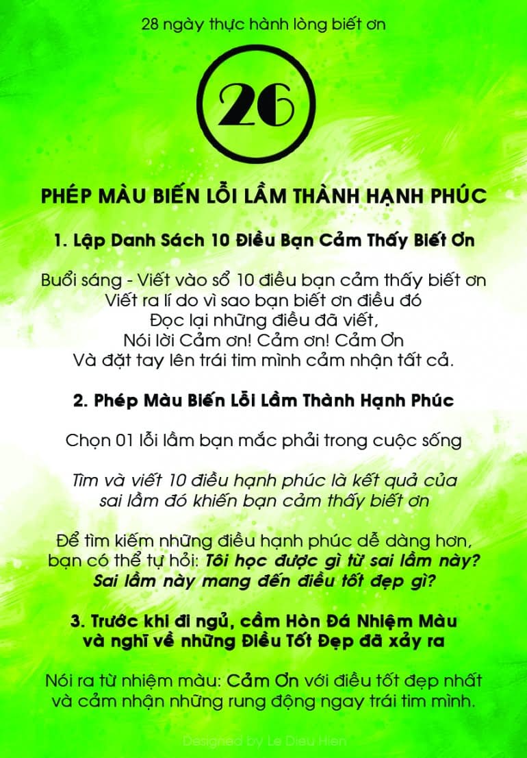Bài tập 26 rất đặc biệt với tên gọi: BIẾN LỖI LẦM THÀNH HẠNH PHÚC trong chuỗi 28 bài tập biết ơn theo hướng dẫn trong cuốn The Magic – Phép màu của cô Rhonda Byrne nha. Đôi khi ta gây ra một lỗi lầm nào đó, ta cảm thấy ân hận, day dứt, đau đớn, và mang cảm giác tội lỗi rất nhiều năm. Và mặc dù là ta có thể tha lỗi cho ai đó dễ dàng, hình như ta vẫn khó có thể tha lỗi cho chính mình. Nếu cứ nuôi dưỡng những cảm xúc như vậy trong lòng thì lâu dần, chúng ta sẽ dần đánh mất lòng tin yêu bản thân, khó thoát khỏi những tổn thương trong quá khứ và đắm chìm trong đau khổ. Với lòng can đảm và trái tim trung thực của bản thân, bài tập hôm nay là một sự nhiệm màu, để chúng ta có thể biến những đau khổ, lỗi lầm thành hạnh phúc. Các bạn có tin vào điều đó không? Nếu các bạn cùng tin thì chúng ta cùng nhau bước vào bài tập này nha!